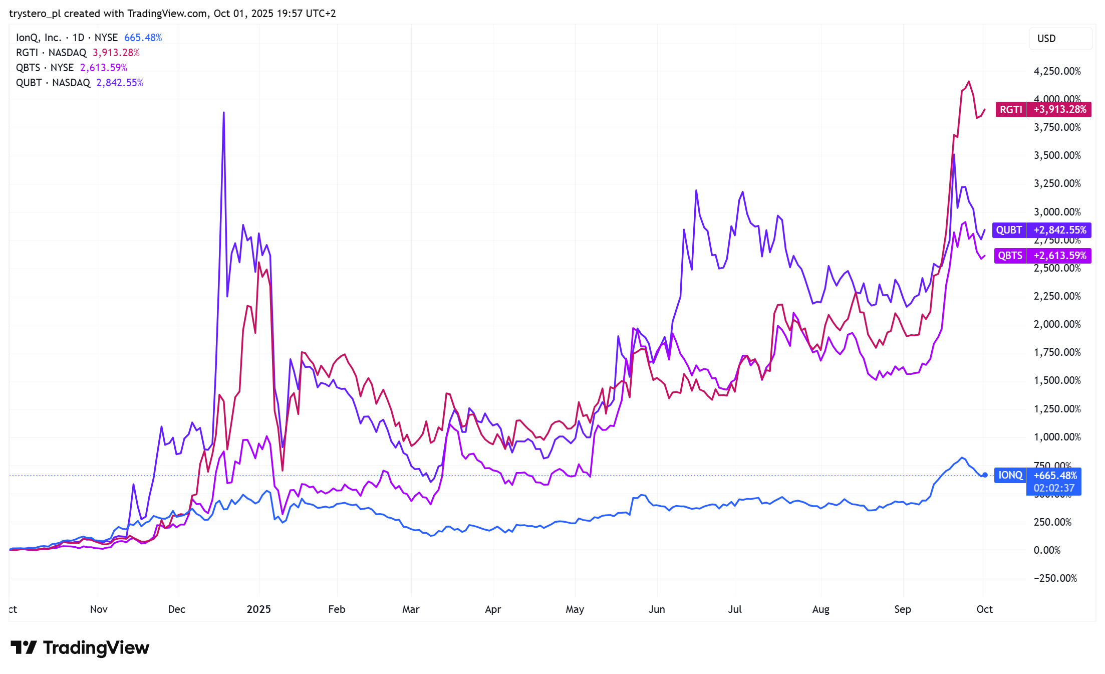 IonQ (22 mld USD kapitalizacji), Rigetti Computing (10 mld USD), D-Wave Quantum (9,5 mld USD) i Quantum Computing (3,5 mld USD) osiągnęły w ostatnich 12 miesiącach przeciętną stopę zwrotu na poziomie 2750%. Mocna narracja wygrywa z fundamentami.