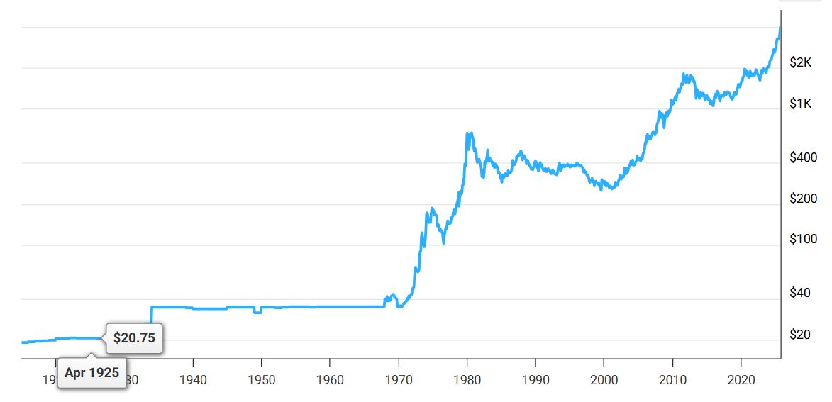 Spójrzmy na wykres złota w perspektywie stuletniej. Tego samego złota, o którym coraz częściej mówi się, że jest najlepszą możliwą inwestycją. Że chroni nas przed inflacją. Że niesie za sobą jedyną realną wartość.