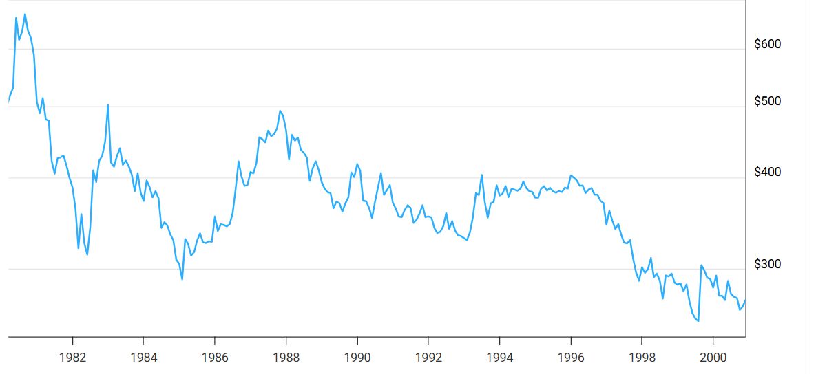 No cóż, któż by się z tym nie zgodził, patrząc na wykres ceny złota od szczytu w 1980 roku (640 dolarów) do chwili, gdy autorzy pisali swoją analizę.