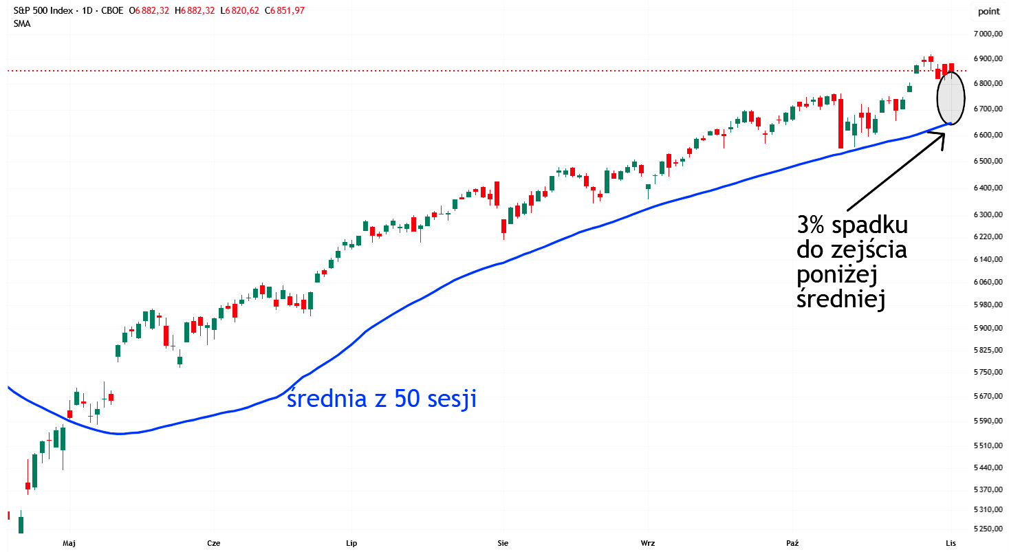 A co musi się zdarzyć, żeby w najbliższym czasie ten rekord miał się nagle skończyć? Pokazuje to poniższa symulacja. Wykres pokazuje zmiany cen S&P500 oraz średnią z 50 sesji biegnącą obecnie poniżej indeksu: