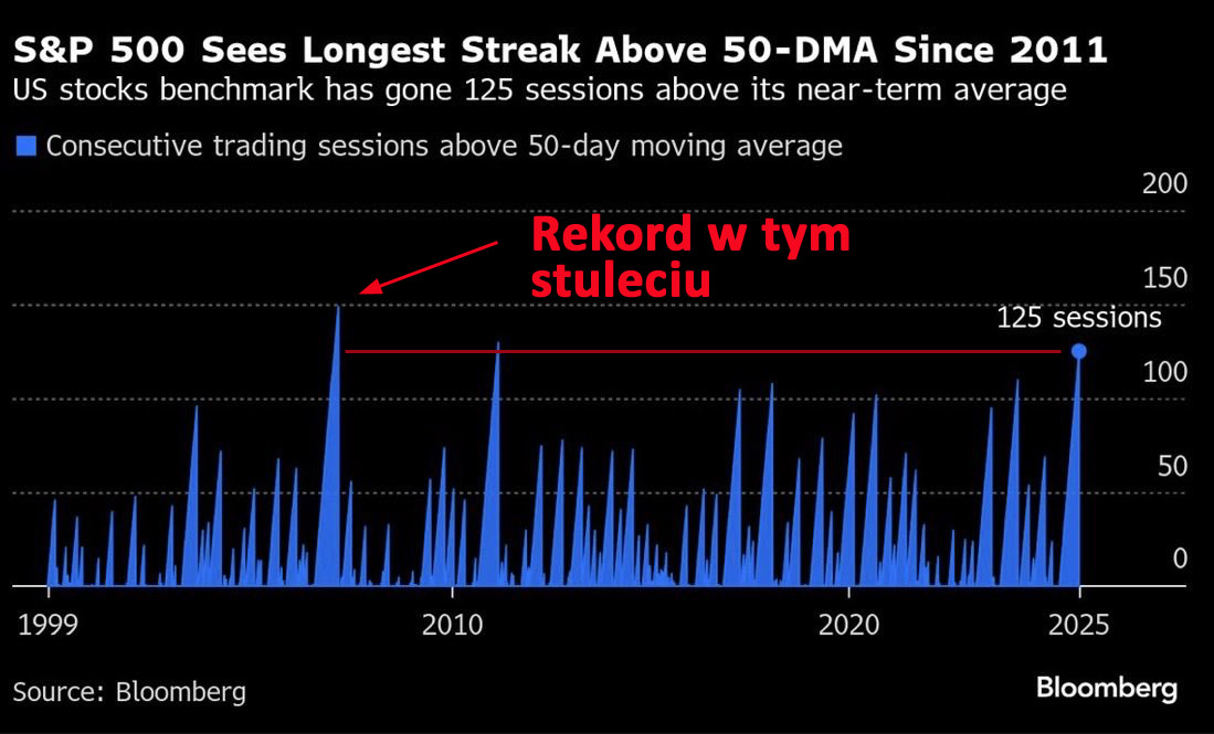 W momencie publikacji tego wykresu indeks S&P 500 był 125. sesję powyżej średniej z 50 dni, dziś urosło to do 129 sesji. Czerwona pozioma linia wskazuje te miejsca w historii, gdzie pojawiały się podobne rekordy.