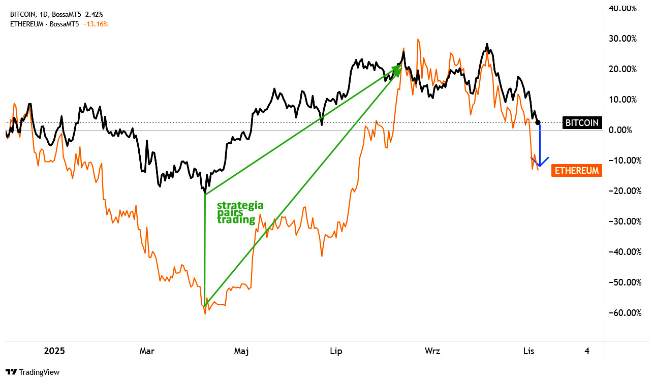 W tym roku mieliśmy potężny rozjazd. Spadki Ethereum od stycznia do kwietnia 2025 były efektem połączenia rozczarowania inwestorów po aktualizacjach technicznych, makroekonomicznej presji oraz rotacji kapitału do Bitcoina przed halvingiem. ETH tracił zarówno wobec dolara, jak i wobec BTC, co doprowadziło do znacznie wyższego niż zwykle rozszerzenia spreadu BTC–ETH w tamtym okresie. Świetna sytuacja do zastosowania strategii (zielone strzałki), choć jeśli ktoś wszedł w nią za wcześnie, musiał przejść relatywnie spory jak na tę strategię zjazd kapitału.