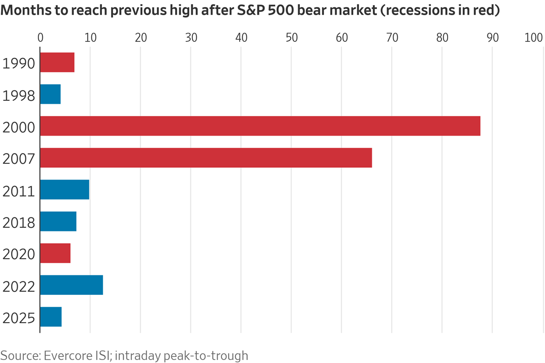 Wykres dnia pokazuje czas potrzebny do tego, by S&P 500 osiągnął nowy szczyt po wejściu w bessę. Czas podany jest w miesiącach i dotyczy okresu od szczytu przed bessą do nowego szczytu.