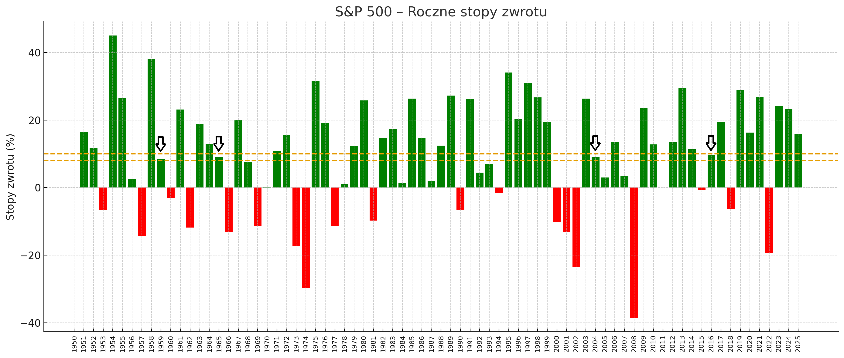 Zachowanie S&P 500 w tym czasie nie wygląda przeciętnie. W ponad 60% przypadków indeks generuje dwucyfrowe stopy zwrotu. Przeciętnie raz na pięć lat indeks notuje spadkowy rok. W kilku przypadkach na 75 lat zanotował boleśnie spadkowy rok.