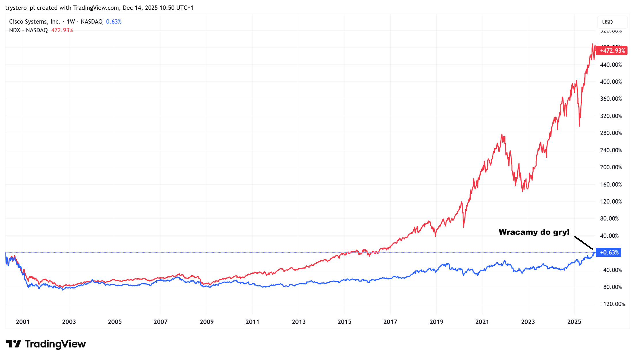 Sytuacja akcjonariuszy Cisco nie wygląda jednak równie źle. Spółka od 2011 roku wypłaca dywidendy. Jeśli uwzględnimy dywidendy, to nowy szczyt typu total return akcje Cisco osiągnęły 16 grudnia 2021 roku. Z punktu widzenia inwestorów Cisco „odrobiło” szczyt z 2000 roku po 22 latach, a nie po 26 latach.