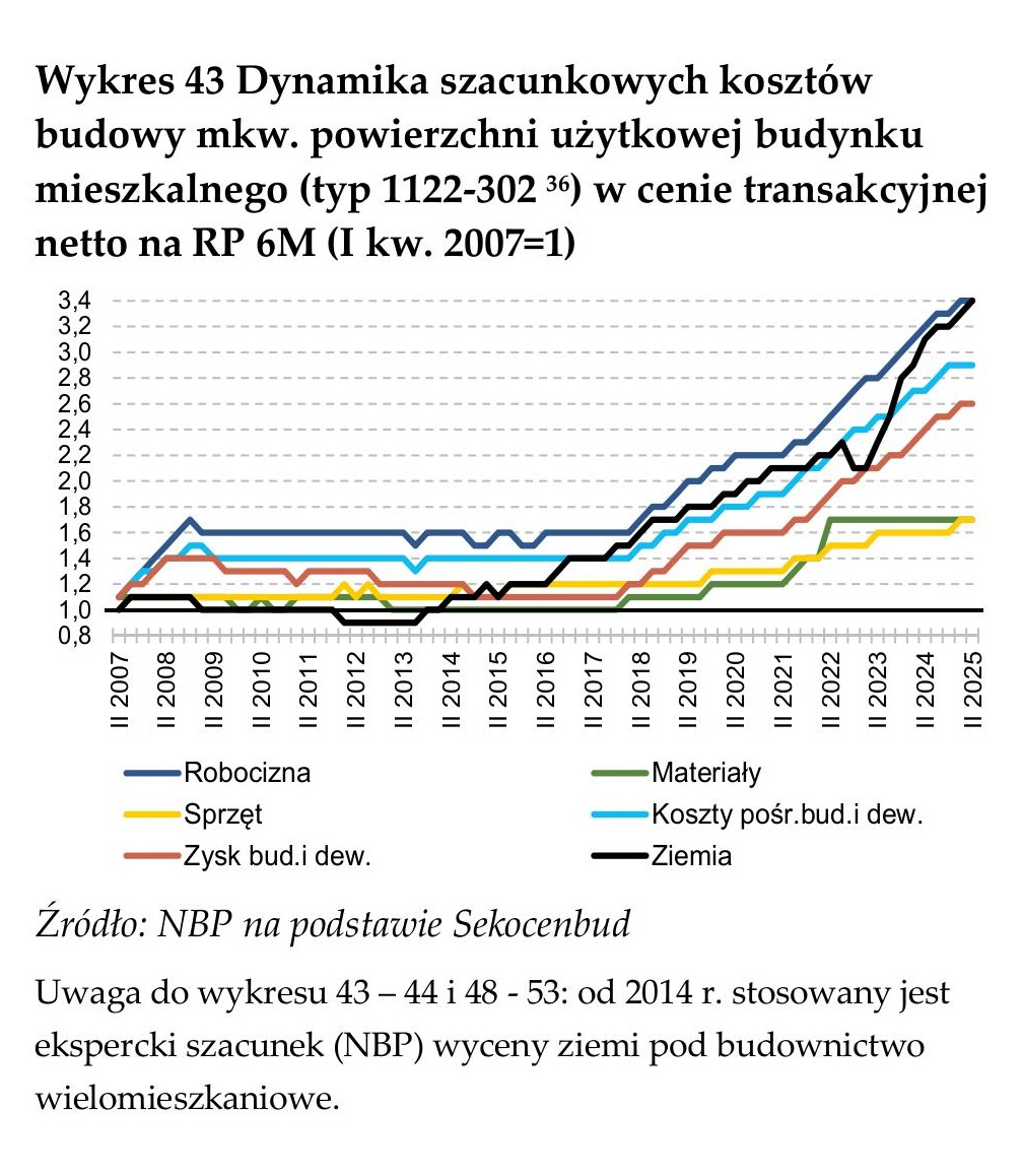 Popatrzmy niżej na wykres 43 opublikowany w ostatnim raporcie NBP „Informacja o cenach mieszkań w II kwartale 2025 r.”. Wynika z niego, że od 2013 do 2025 r. koszt ziemi w cenie budynku mieszkalnego wzrósł o 240 proc. Dla porównania, zysk dewelopera wzrósł w tym okresie o 117 proc. Dlaczego ceny ziemi rosną szybciej niż zyski deweloperów? Dlatego, że ziemi w dobrych lokalizacjach, czyli zwykle w miastach, z infrastrukturą, jest ograniczona ilość. Budynek może wybudować wiele firm, ale działka w danym miejscu jest tylko jedna. Właściciel ziemi jest monopolistą i czerpie z tego monopolu rentę. To dodatkowy zysk wynikający tylko z faktu, że dysponuje dobrem, którego podaż jest ograniczona, a które jest innym niezbędne do życia.