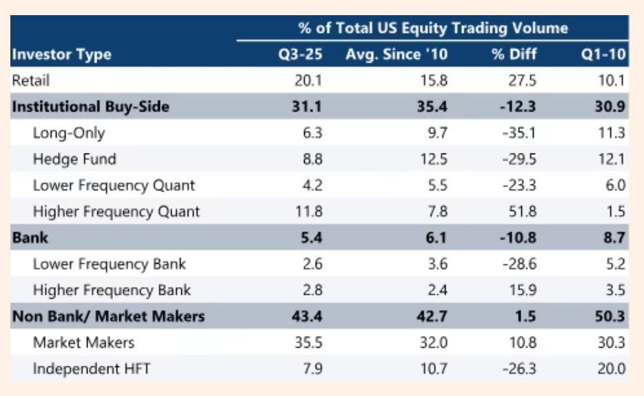Aby zrozumieć skalę zmiany, musimy spojrzeć wstecz. Po II wojnie światowej inwestorzy indywidualni w USA posiadali około 80-85% wszystkich akcji i być może nawet wykonywali większość obrotu akcjami (nie ma na to twardych statystyk, to bardziej szacunki). Byli jednak fundamentem kapitalizmu. Potem nastąpiła era instytucjonalizacji, gdy fundusze emerytalne i powiernicze przejęły rynek, spychając detal do defensywy. Dziś bezpośredni udział detalu w obrocie to 20%. Poniższa, świeżutka statystyka z FT.com pokazuje rozkład sił i zmiany w ostatnich latach: