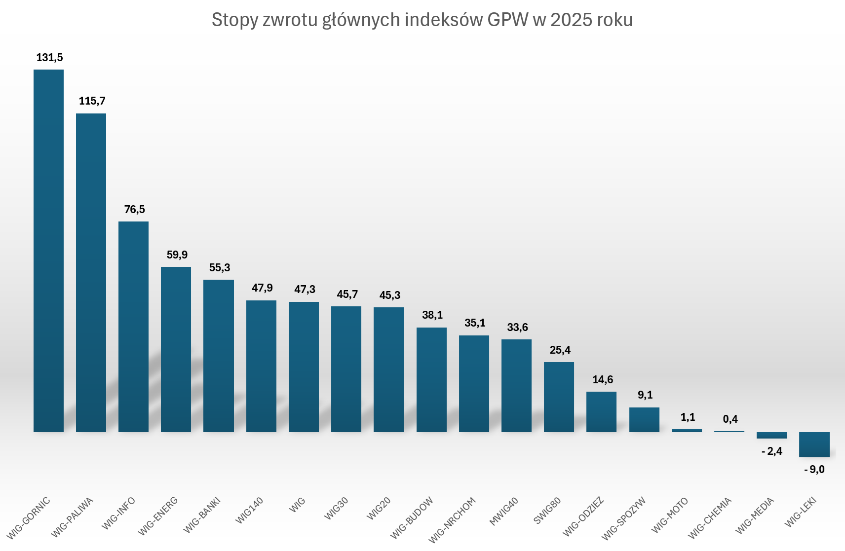W 2025 roku najlepszymi indeksami sektorowymi okazały się „indeksy jednej spółki” – WIG Górnictwo (KGHM), WIG Paliwa (Orlen) i WIG Informatyka (Asseco Poland). Dobrze spisały się spółki energetyczne dzięki korzystnemu otoczeniu regulacyjnemu.