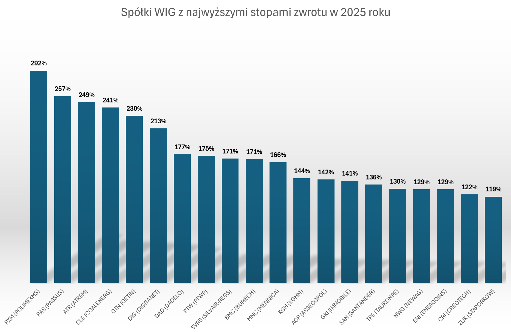 „Wykresowe podsumowanie” 2025 roku na GPW kończą zestawienia najlepszych i najgorszych spółek z indeksu WIG (takie zestawienie eliminuje pozbawione płynności walory z marginesu rynku). Dane z BiznesRadaru.