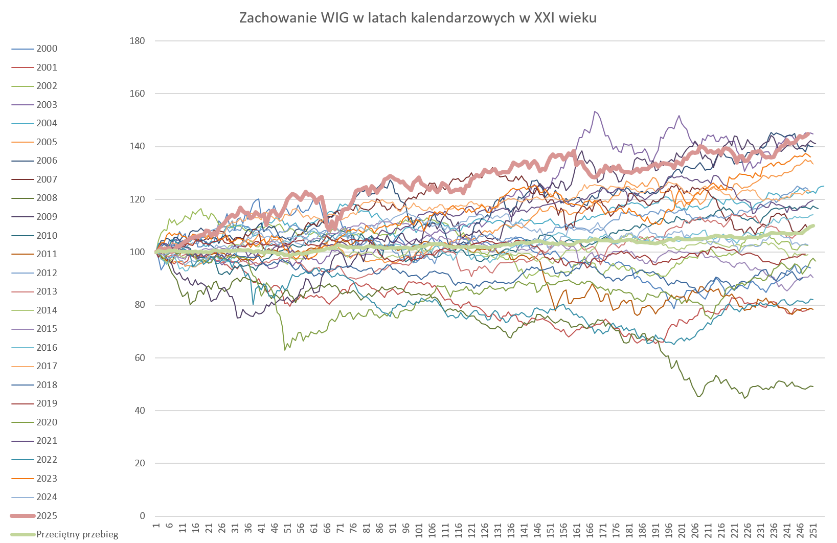 Zachowanie WIG w roku kalendarzowym było korzystne dla inwestorów – indeks nigdy nie znalazł się „pod kreską”. Dynamiczna i budząca strach przecena z okresu Dnia Wyzwolenia, czyli początku wojny handlowej, była największą inwestycyjną przeszkodą w 2025 roku. Obsunięcie nie sprowadziło jednak WIG „pod kreskę”, a dodatkowo zostało szybko zneutralizowane.