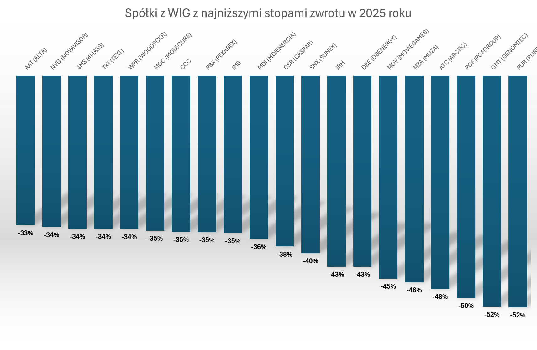 „Wykresowe podsumowanie” 2025 roku na GPW kończą zestawienia najlepszych i najgorszych spółek z indeksu WIG (takie zestawienie eliminuje pozbawione płynności walory z marginesu rynku). Dane z BiznesRadaru.