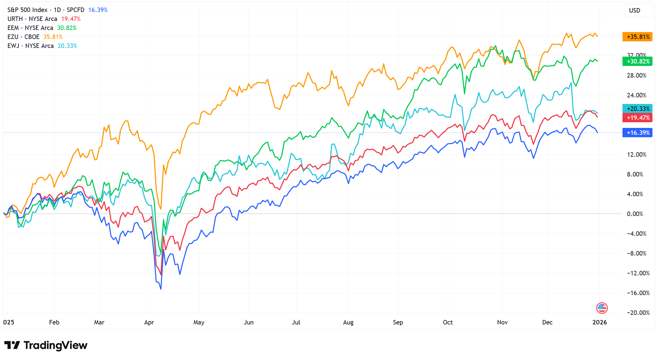 Amerykański rynek akcyjny przegrał w 2025 roku z globalnym rynkiem akcyjnym. Wszystkie istotne segmenty globalnego rynku akcyjnego (Europa, Japonia, rynki wschodzące) osiągnęły w ujęciu dolarowym wyższe stopy zwrotu niż S&P 500. Akcje ze strefy euro zakończyły 2025 rok zwyżką o 35,8% i zdeklasowały wynik S&P 500 (16,8%). Pokazuje to poniższy wykres notowań ETF-ów na główne segmenty rynku akcyjnego – strefę euro (pomarańczowa linia), rynki wschodzące (zielona), rynek globalny (czerwona), rynek japoński (turkusowa) oraz S&P 500 (niebieska).