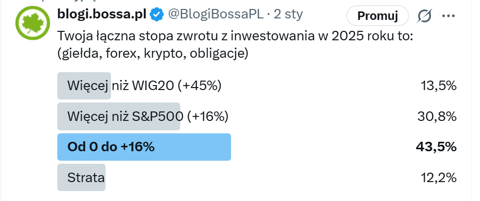 Co o polskich inwestorach i traderach mówią wyniki osiągnięte w 2025 roku? Chodzi oczywiście o szacunkowe ich rozkłady, które pojawiły się w sondzie na naszym profilu X: