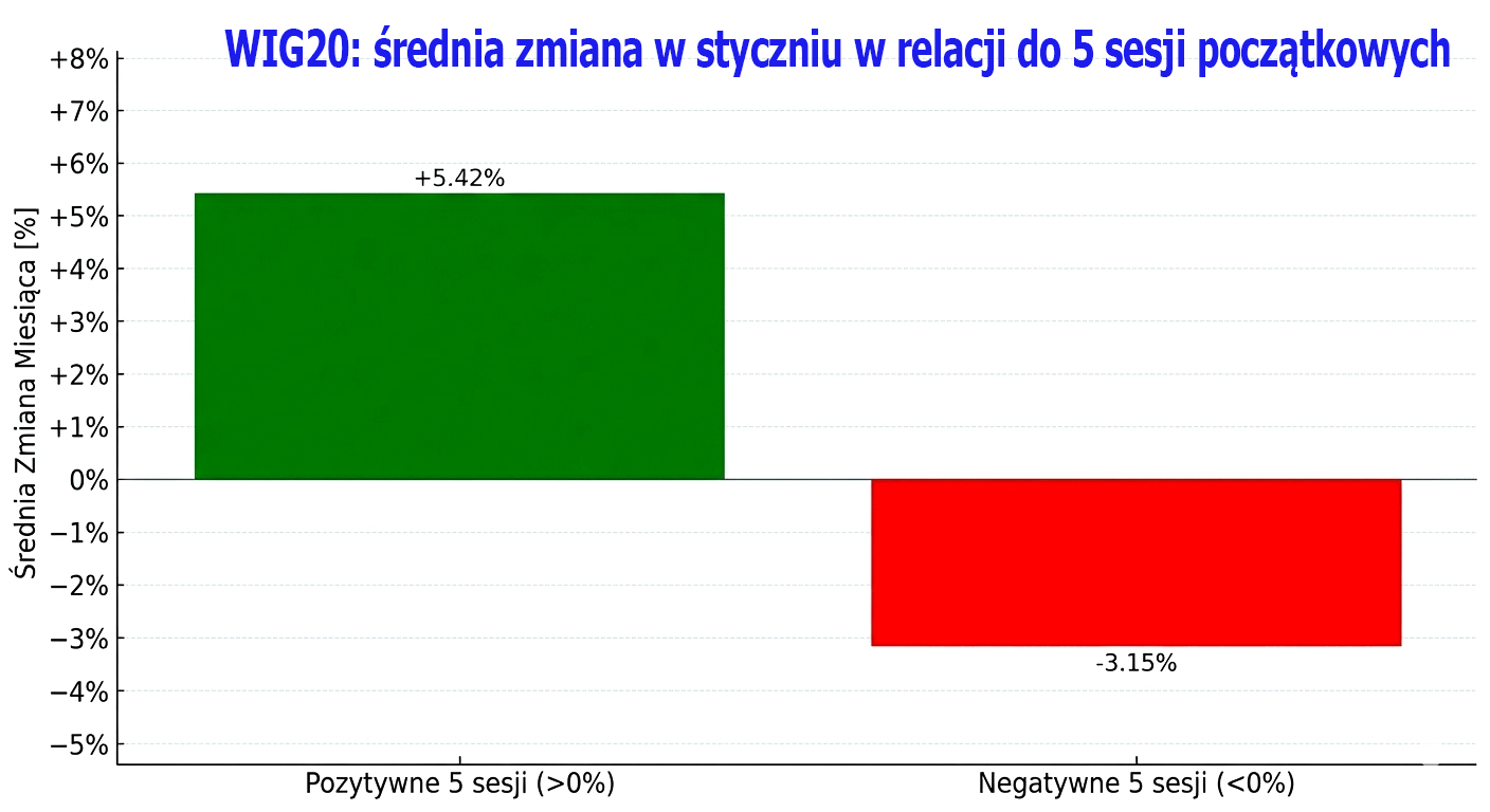 - Jeśli 5 sesji początkowych było w sumie ujemnych, to średnia zmiana stycznia = -3,15% (w 36% przypadków styczeń kończył się na plus).