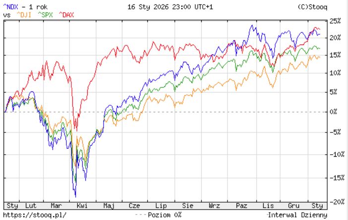 Z tej perspektywy patrząc Donald Trump w wersji 2.0 był całkiem dobry dla inwestorów, którzy skupiają się na inwestowaniu w indeksy. W skali 12 miesięcy S&P500 rośnie o blisko 17 procent, gdy Nasdaq 100 zyskuje 21 procent przy zwyżce DJIA o przeszło 14 procent. Również inwestorzy na rynkach innych niż amerykańskie mają powody do świętowania. Niemiecki DAX – nawet po dwóch dniach spadków – w perspektywie roku zyskuje niemal 17 procent.