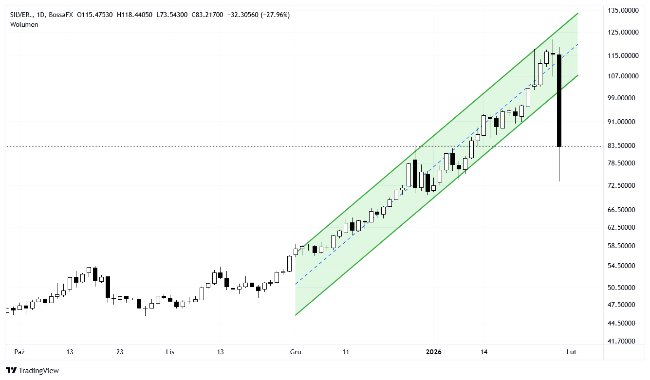 Krach nie wynikał nie tyle z fundamentalnej słabości srebra, lecz z nagłej podaży, braku płynności i zamykania lewarowych pozycji w kontraktach z powodu podwyższenia zabezpieczeń przez giełdy, w tym CME oraz wielu brokerów w ślad za nią. Potem już odpalały się stop-lossy, dochodziła kaskada sprzedaży i sprzedaży krótkiej z rynku.