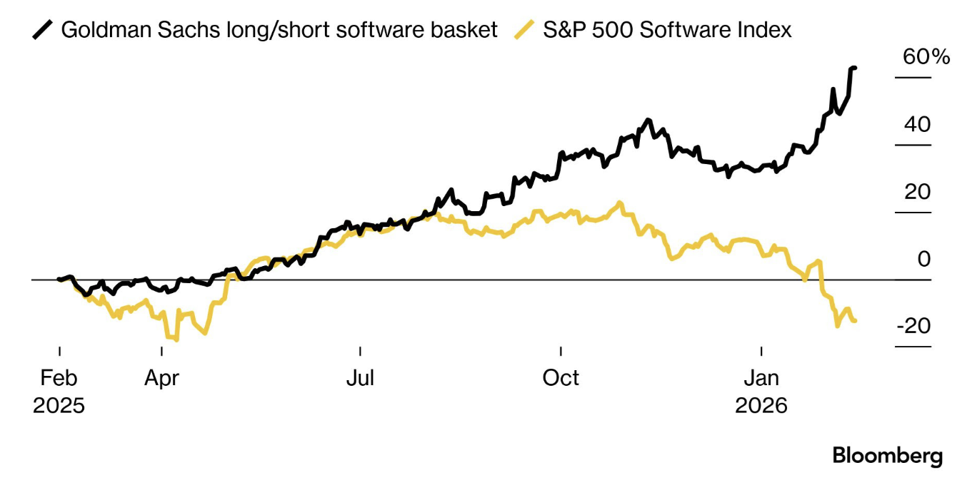 Analitycy Goldman Sachs zaprojektowali koszyk typu pair trade, który ma wykorzystać rozwarstwienie w sektorze IT. Koszyk zakłada długie pozycje na spółkach software’owych z trudnym do zastąpienia biznesem oraz na spółkach, które są bezpośrednimi beneficjentami wzrostu wydatków na infrastrukturę AI. To firmy z obszaru infrastruktury obliczeniowej, chmury (w tym hyperscalerzy), cyberbezpieczeństwa, narzędzi deweloperskich i platform AI.