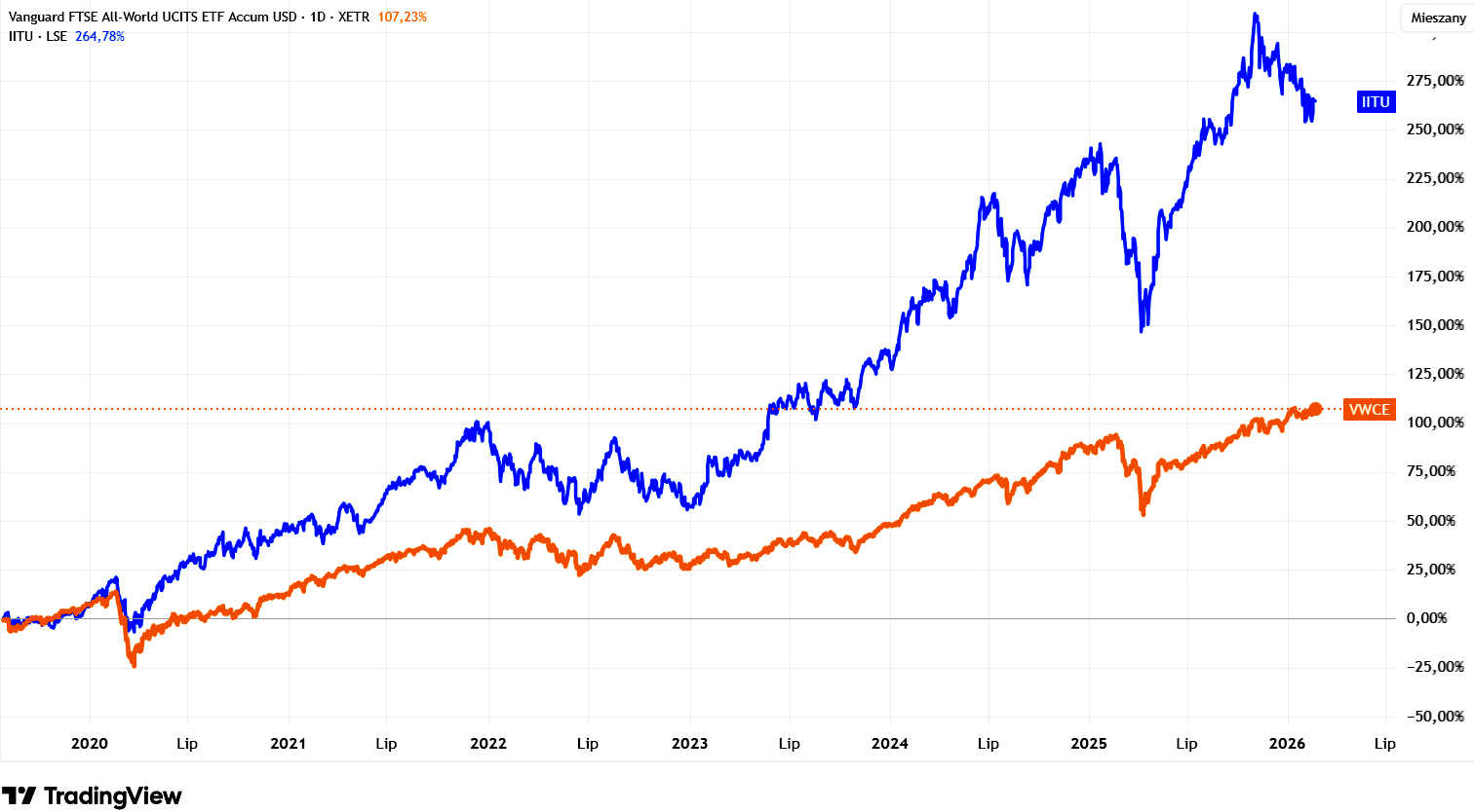 Akurat z Nasdaq czy technologiami jest taka sytuacja, że zwroty są daleko wyższe niż benchmark typu VWCE. Teoretycznie to mógłby być jedyny wybór patrząc na poniższy wykres technologicznego IITU (także popularny w DM BOŚ) na tle WVCE: