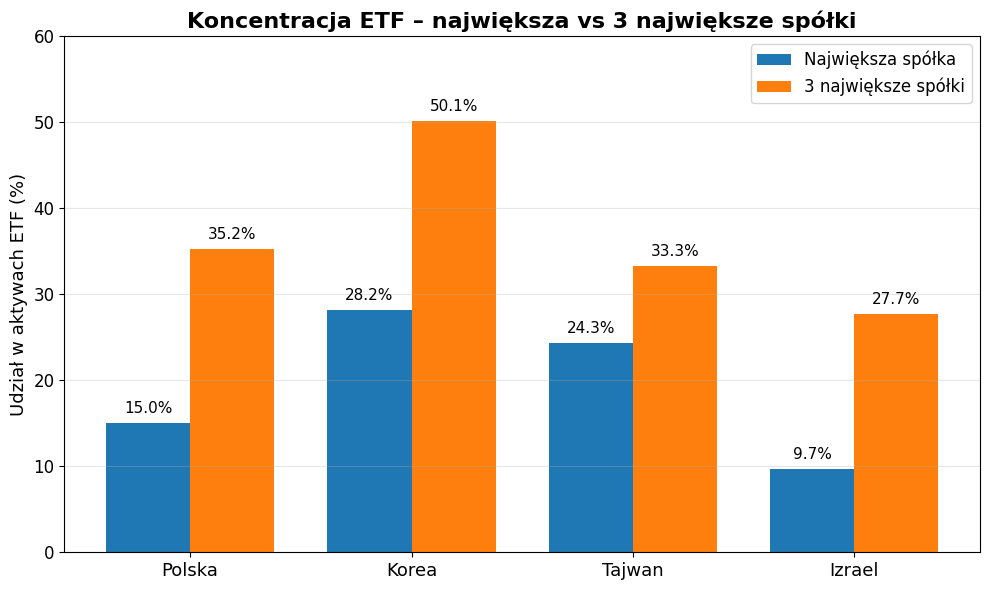 Warto zauważyć, że w moim zestawieniu to Polska jest liderem koncentracji w ujęciu „top 10” spółek. Dla pozostałych rynków miara koncentracji w aktywach ETF-ów wynosi od 49% (Tajwan) do 63% (Korea).