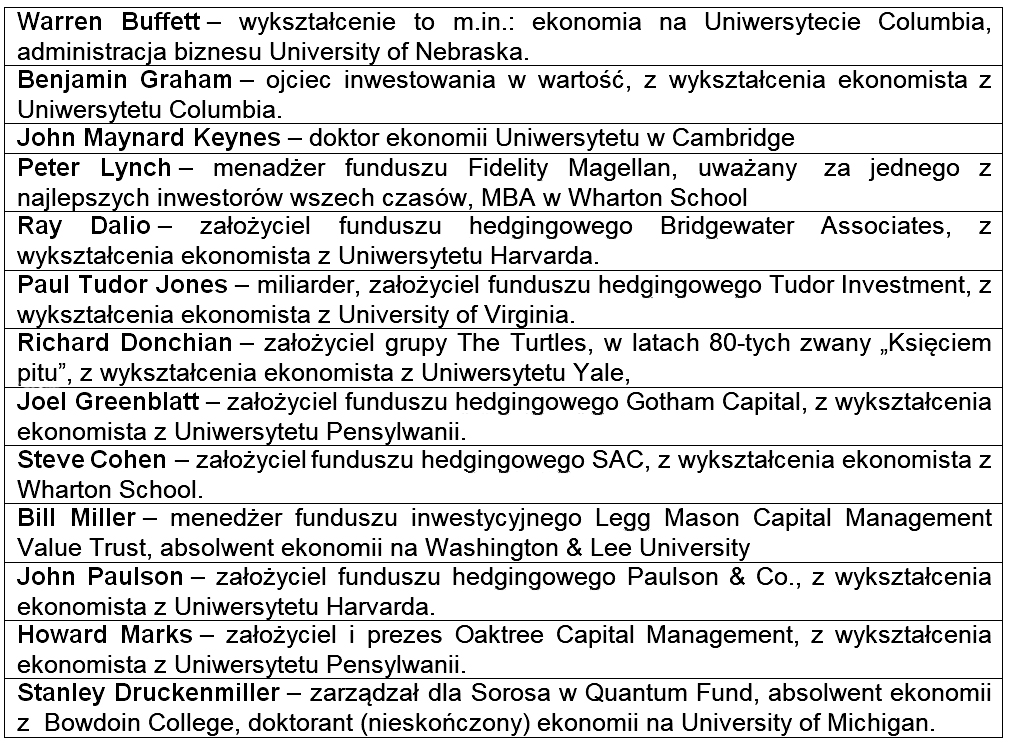 Interesowało mnie ich wykształcenie. Jak widać w tym zestawianiu, wszyscy z nich zaliczyli studia ekonomiczne, włącznie z otwierającym tę listę Warrenem Buffettem. I w zasadzie na tym można by zamknąć dyskusję. Dodam, że nie byłem w stanie zaleźć legend inwestowania, których byli specjalistami w dziedzinie fryzjerstwa (choć nie wykluczam, że może takie postacie w tej branży istnieją).