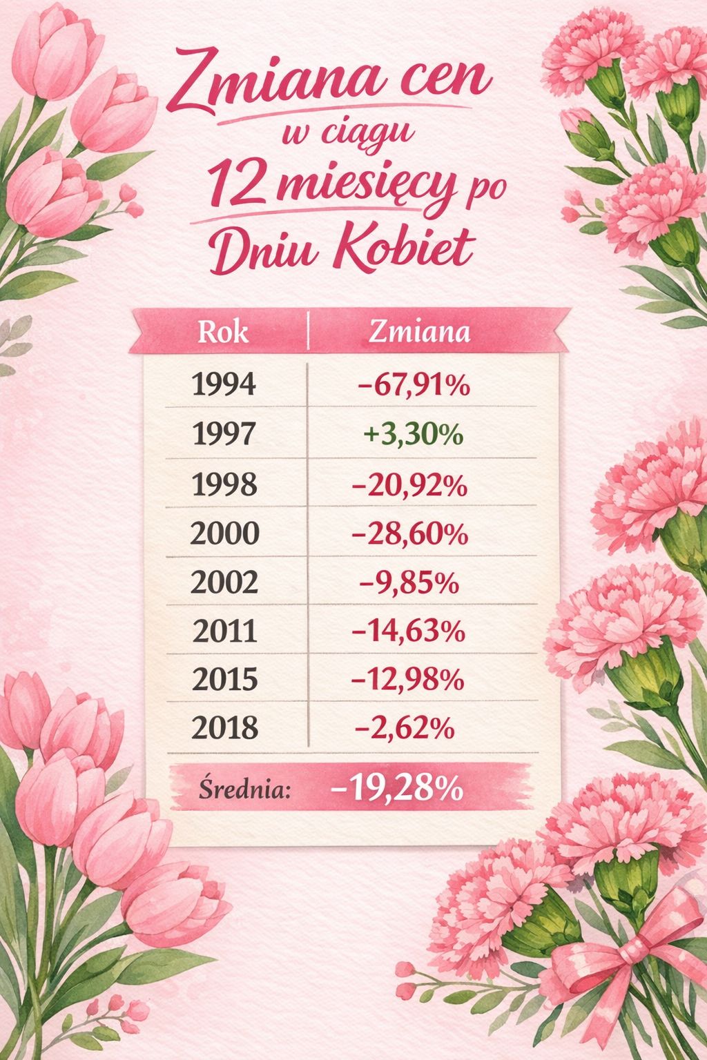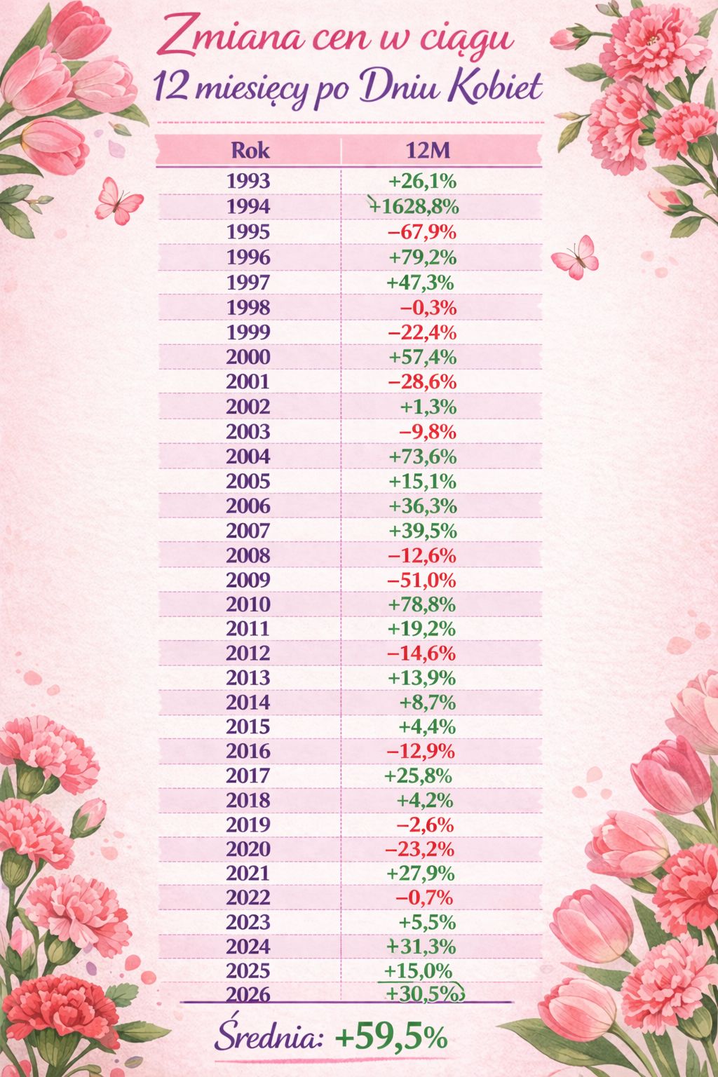 Zbliża się koniec marca, od tegorocznego Dnia Kobiet indeks WIG obsuwa się coraz niżej i wygląda na to, że nie powiedział jeszcze ostatniego zdania. A czy mieliście świadomość tego, że 8 marca na warszawskiej giełdzie to data nieco „przeklęta”. Wszystko zaczęło się w 1994 roku, roku wielkiej hossy i roku pierwszego wielkiego krachu na GPW. To właśnie Dzień Kobiet w 1994 roku wyznaczył wieloletni szczyt. Akcje polskich spółek potrzebowały dziesięciu lat, żeby trwale pokonać tamten szczyt. A jeśli dodam, że Dzień Kobiet kilkukrotnie zapowiadał znaczące spadki, to zrobi się naprawdę groźnie.